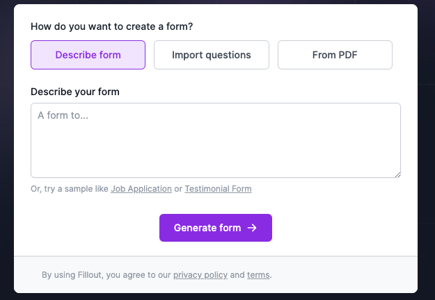 Fillout.com : Import an existing form or generate a new one with the first AI form builder