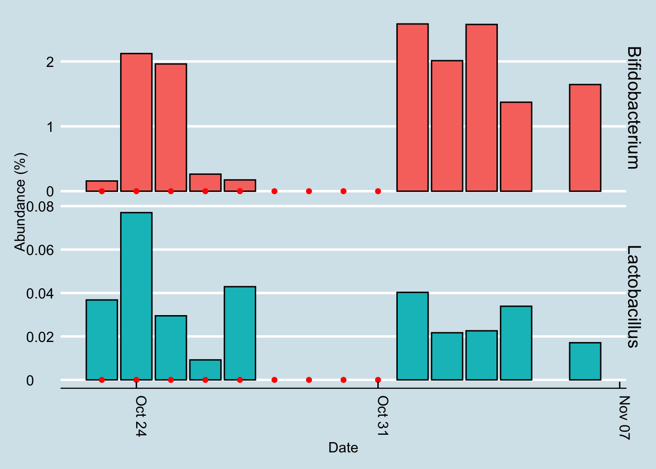 The red dots represents days when I took a gut sample after consuming the probiotic. Ignore the days with zero abundance: those are samples where the lab was unable to find enough DNA to process correctly. [In technical speak, this chart shows only those with more than 10,000 reads].