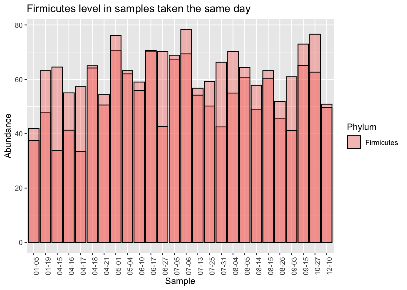 When we eyeball it, the Firmicutes doesn’t appear to vary a whole lot between the same-day samples. The black lines in each of the bars is the level of Firmicutes found in the second sample. Although there are a few significant exceptions (04-15, 06-27, 07-31), most of the time the levels for this microbe seem pretty close no matter where you sample.