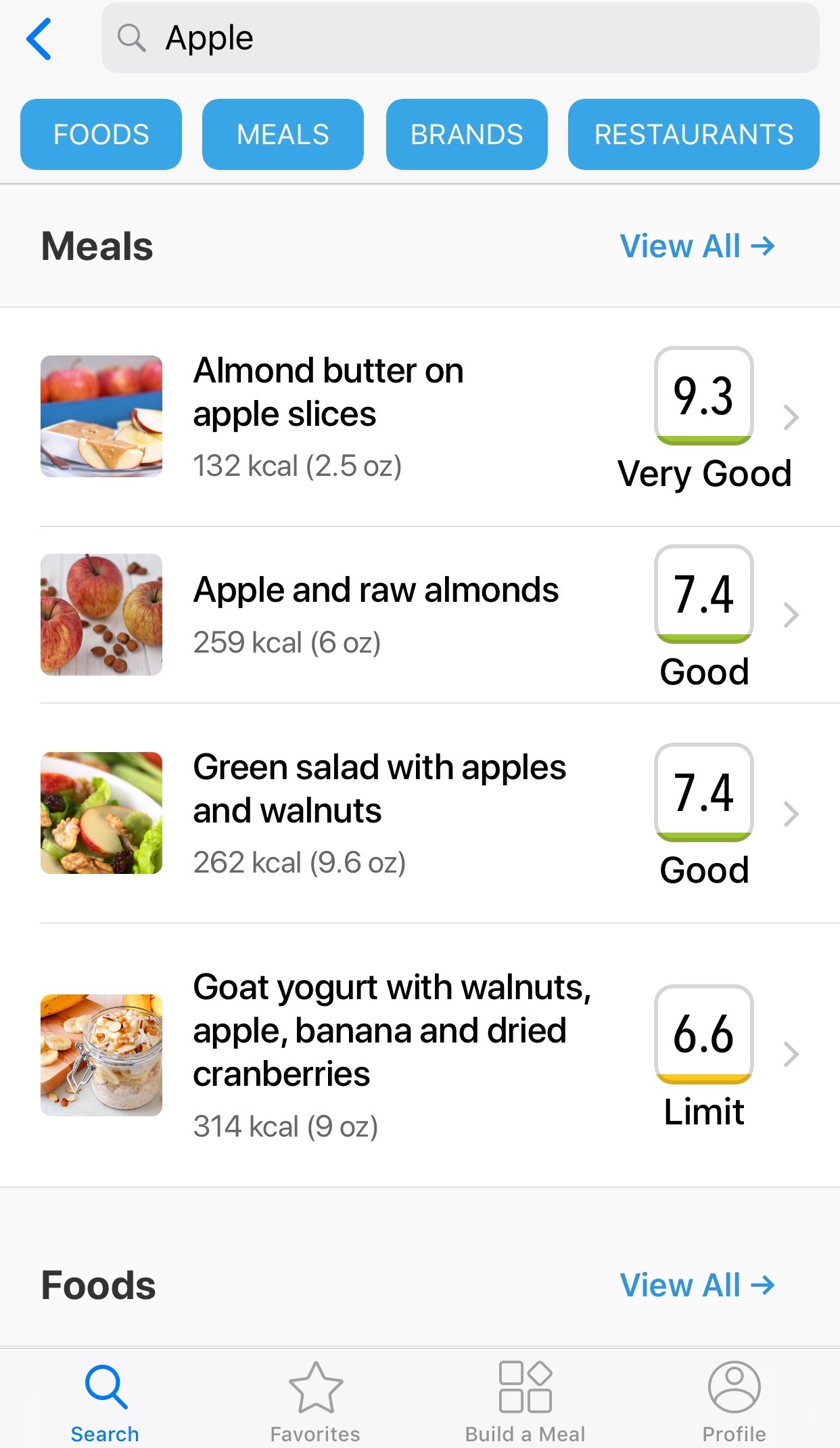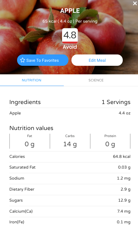 But note that DayTwo thinks it’s simplistic to discuss a food in isolation. Humans usually eat combinations of food, so what we really should care about is the whole meal and not specific ingredients. Here’s what I get when I search for “Apple” in the DayTwo App: