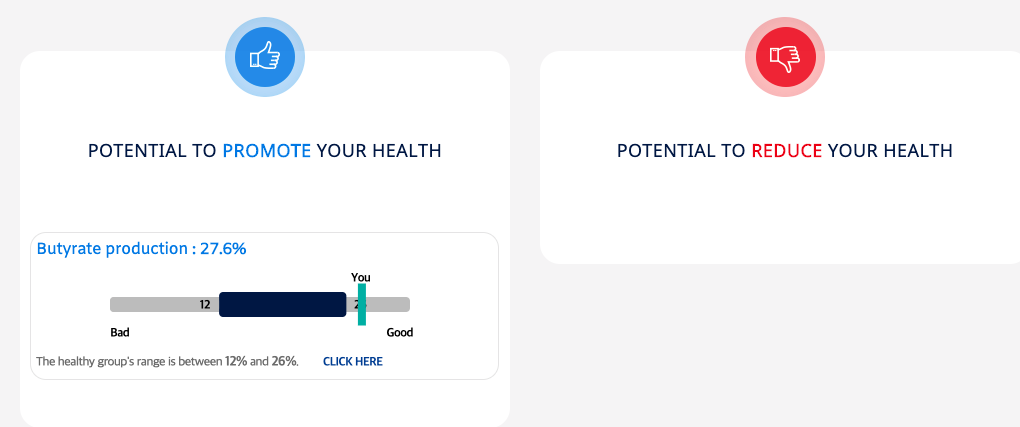 At last I reach something that indicates a problem. My score, 38, is below the healthy range (41-69). Confusingly, according to the report “a high score means beneficial/non-beneficial metabolites balance is unstable by dysbiosis.” Hmmm, I’m not sure what that means, and anyway I have a low score. Does that mean my situation needs improvement, or am I in better shape than average? It’s unclear, but being out of the healthy range doesn’t look good.