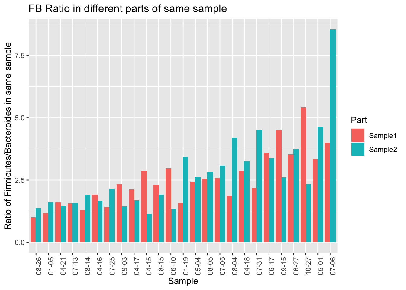 When we eyeball it, the Firmicutes doesn’t appear to vary a whole lot between the same-day samples. The black lines in each of the bars is the level of Firmicutes found in the second sample. Although there are a few significant exceptions (04-15, 06-27, 07-31), most of the time the levels for this microbe seem pretty close no matter where you sample.
