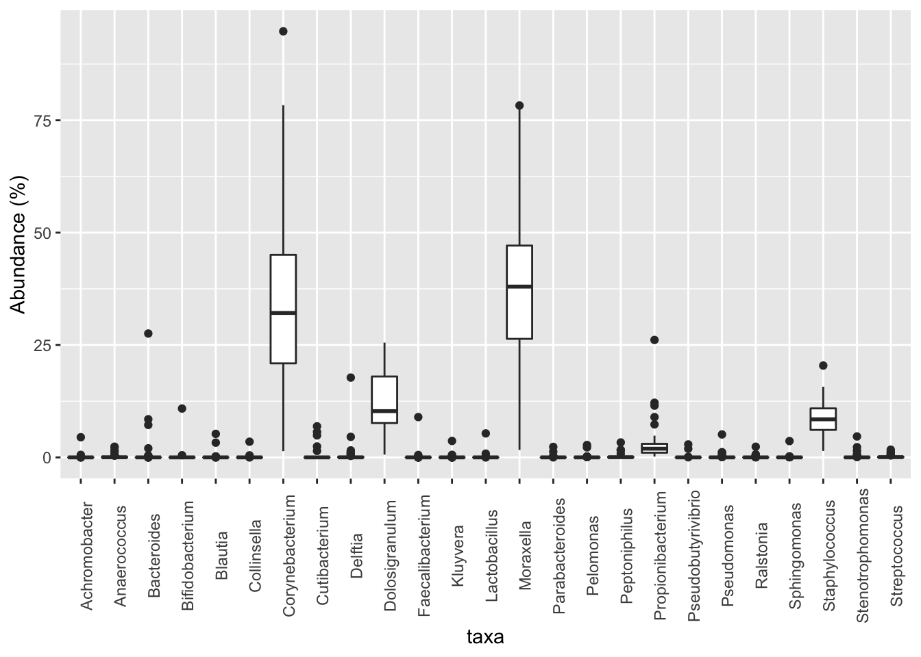 Finally, if you’re curious about which microbes are most common in my nose, the following chart shows that the vast majority are Corynebacterium and Moraxella, with a steady small amounts of Dolosigranulum and Propionibacterium. I occasionally have a spike of Staphylococcus, a usually benign and perhaps even beneficial microbe that can turn pathogenic under some circumstances.