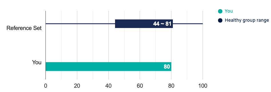 At first glance I was disappointed to see a number so far from 100, but the company explains that the “Healthy” comparison range goes from 34 to 63. Paradoxically I guess this means that anything over 63 is suspect, though the report itself isn’t clear about that.
