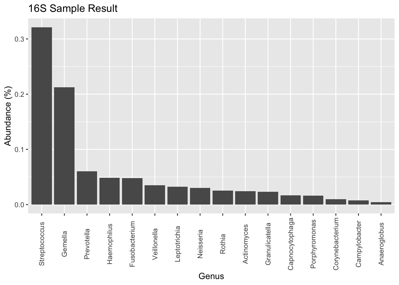 labs(y="Abundance (%)", x = "Genus", title = "16S Sample Result")