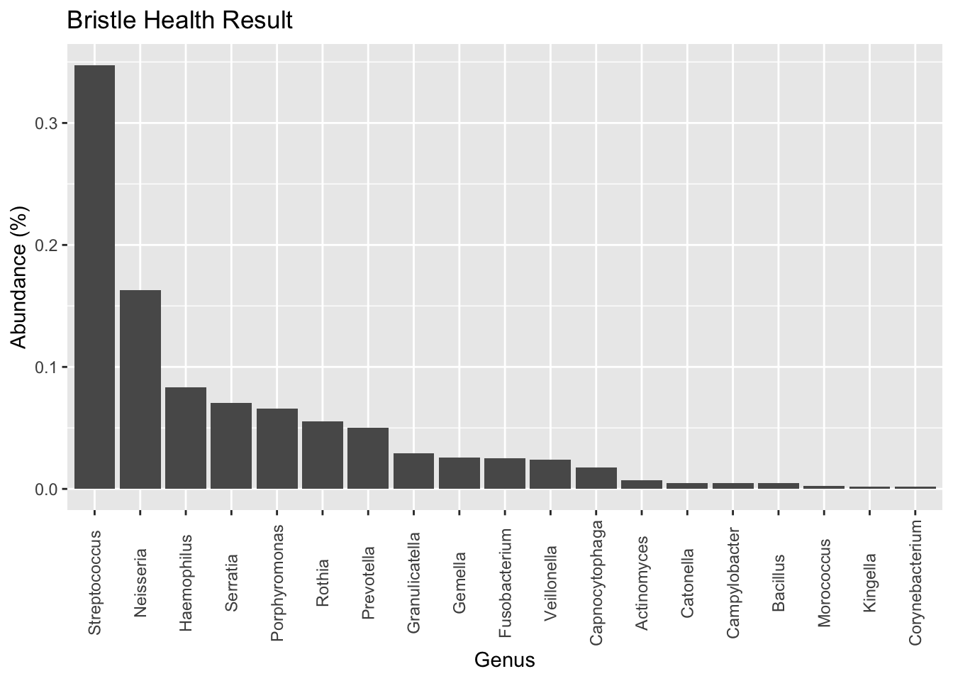 labs(y="Abundance (%)", x = "Genus", title = "Bristle Health Result")