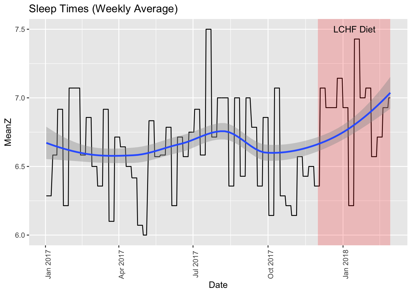 To round out the example, note that I highlighted the part of the graph that represents the LCHF days. I also added a “loess” curve that shows the moving average of my sleep across time.
