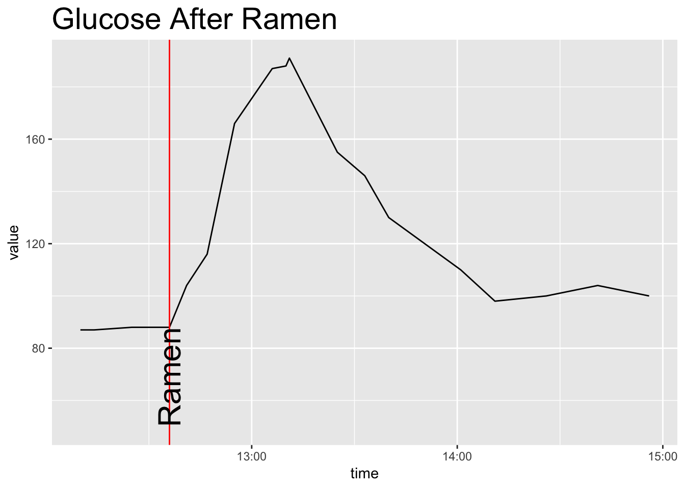 That huge spike is proof that ramen is especially bad for me. I’ve tried several other foods, but never have I spiked so high. Yup,