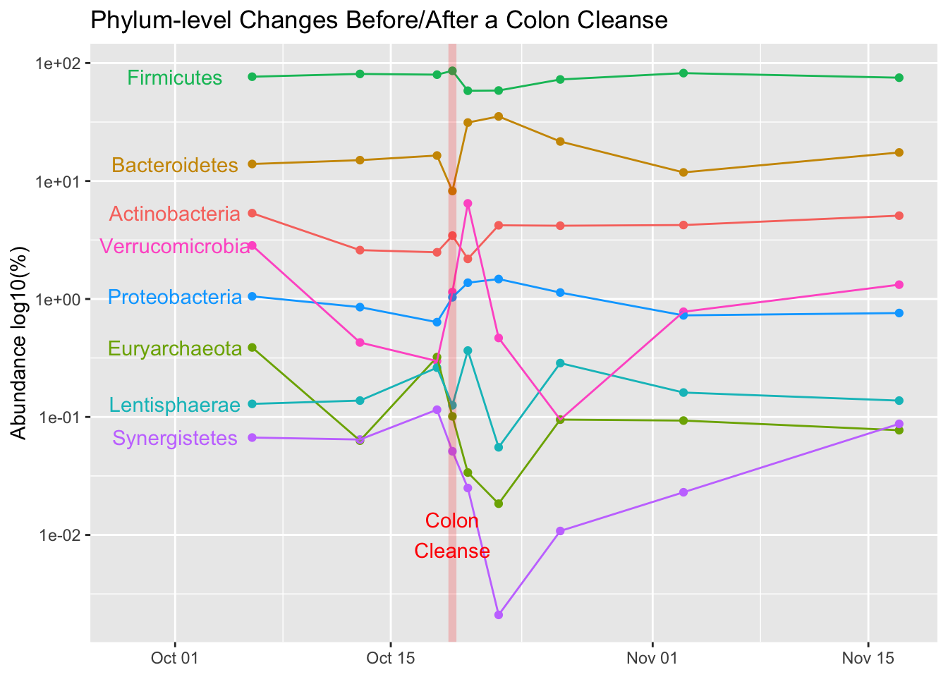 labs(title = "Phylum-level Changes Before/After a Colon Cleanse",