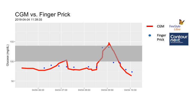 I decided to compare my CGM with an off-the-shelf finger prick glucose testing device – usually considered the at-home gold standard. I did a similar test several months ago, and found that two separate finger prick glucose testers from two different manufacturers agreed with each other when taken at the same time, and that the CGM agreed after a ten-minute lag.